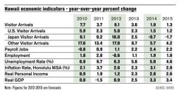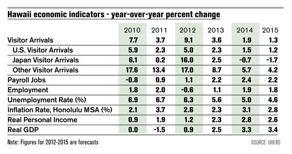 Tourism continues to lead the state’s economy, the report said. Visitor arrivals were up 10 percent in the first eight months of the year, nearly half-a-million more people than in the same period in 2011, and visitor days were also up 10 percent statewide. UHERO estimates that 7,825,700 travelers will visit the state this year, and that number will climb to 8,104,700 in 2013. Bonham said it’s still possible that there will be 8 million visitors this year. What will determine whether the state reaches the 8 million visitor mark, he said, is whether visitors will travel to the Neighbor Islands when Waikiki hotels are full.