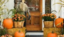 Create a welcoming entry for guests with a display of fall-themed items around your front door. Traditional favorites like pumpkins and bales of hay, layered with mums in rustic wooden baskets, create a color theme of orange and tan, with an emphasis on natural elements. Add visual interest by varying the pumpkin sizes and shapes.…